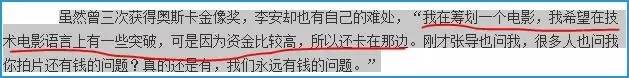 李安《比利-林恩的中场战事》找投资并不易。张艺谋当年拍完《归来》做宣传时去纽约,邀请李安看片,之后两人在纽约大学进行了一场对谈。那时候张艺谋说自己下一个计划是接好莱坞大项目《长城》,李安在筹备《比利-林恩》,但是因为钱的问题卡住了,很犯难。