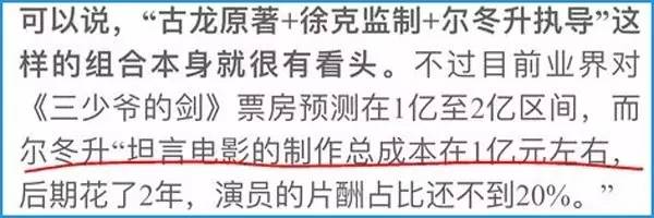 但博纳和尔冬升还是拍了《三少爷的剑》,口碑不好,票房也只有9700万(片方分成约3700万)。据说,这部片成本1亿左右,净亏损6300万。