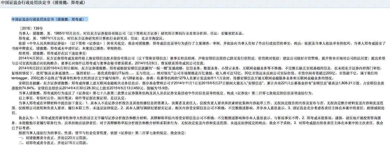 证监会决定,对安硕信息给予警告,并处以60万元罚款;对董事长高鸣给予警告,并处以30万元罚款;对董事会秘书曹丰给予警告,并处以20万元罚款。证监会也对浦俊懿、郑奇威等开出了行政处罚决定书,分别处以20万元罚款。
