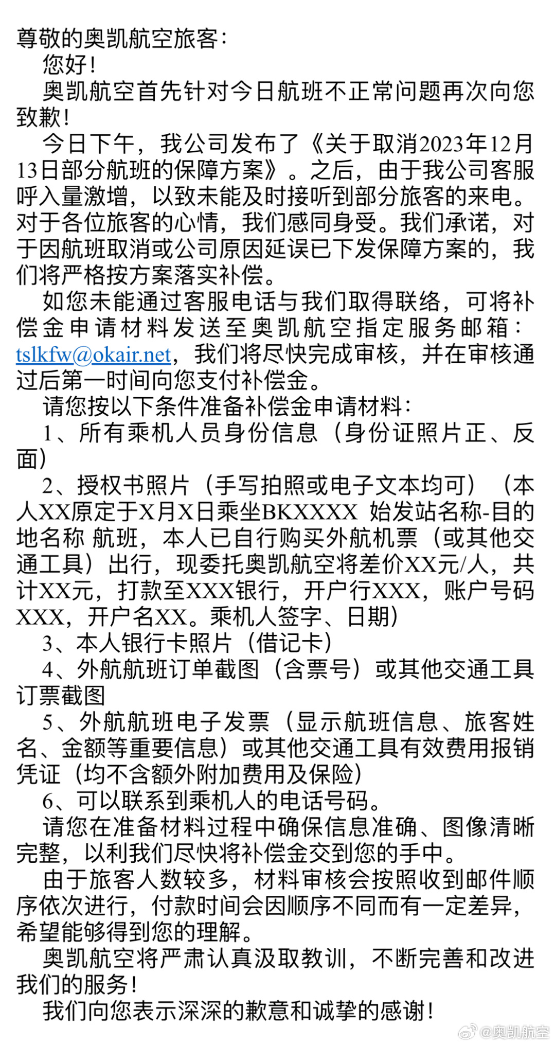 12月13日,@奥凯航空 官方微博发文就今日航班不正常问题致歉:今日下午,我公司发布了《关于取消2023年12月13日部分航班的保障方案》。之后,由于我公司客服呼入量激增,以致未能及时接听到部分旅客的来电。我们承诺,对于因航班取消或公司原因延误已下发保障方案的,我们将严格按方案落实补偿。