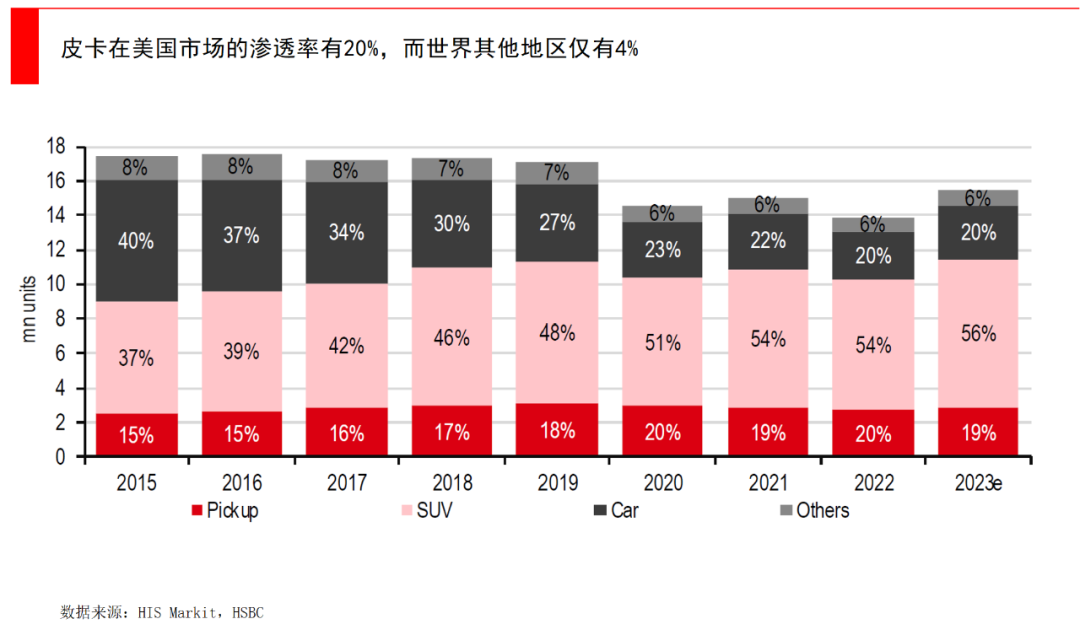 皮卡占据了美国每年20%的轻型汽车总销量,而欧洲和中国仅为1%。