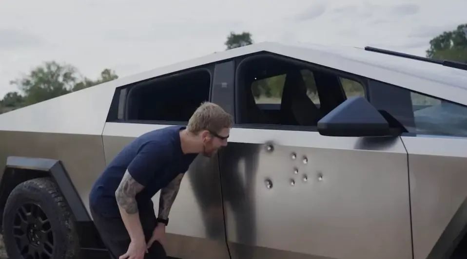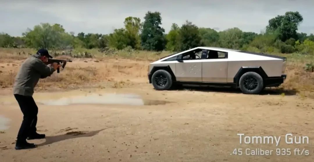 这种材料到底有多坚硬?下面这个爆火的截图已经说明了一切。Cybertruck能防弹,在“暴力防弹测试”中,没有任何一颗子弹穿透车门,无论是汤普森冲锋枪、MP5还是9mm手枪,都被结结实实的挡住了。