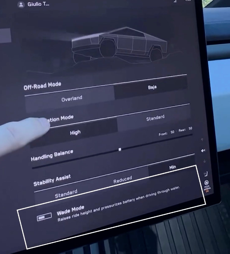 Cybertruck有一个名为“涉水模式”(Wade Mode)的功能,主要是为了帮助车辆在水中行驶并避免损坏。