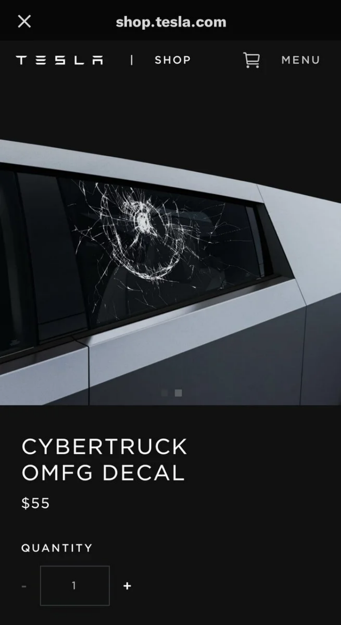 当然,4年后马斯克又把弗朗茨拉来,又扔了一次钢球,这次车窗玻璃完好无损。马斯克甚至还在特斯拉商城上架了一款奇葩周边,售价55美元的Cybertruck皮卡玻璃裂纹贴花,以纪念4年前的这起意外。
