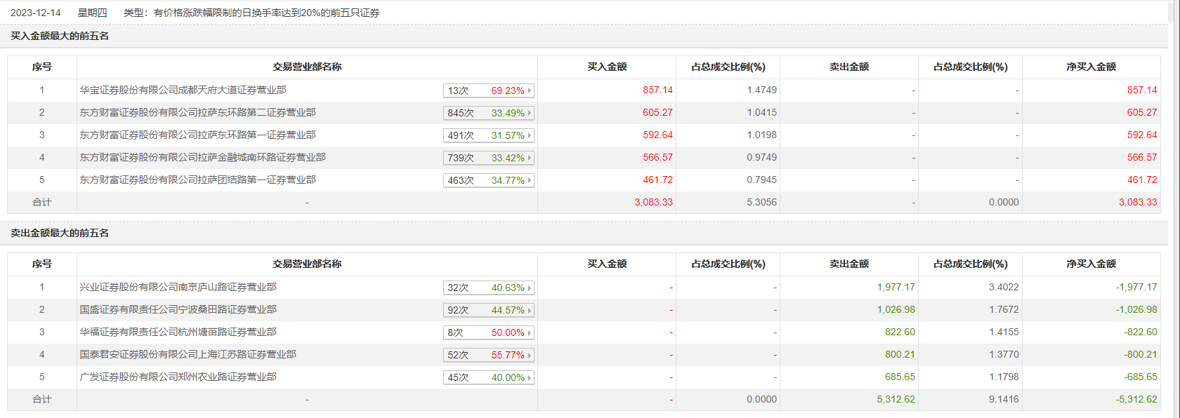 具体来看,知名游资现身龙虎榜,华宝证券成都天府大道证券营业部、东方财富证券拉萨东环路第二证券营业部分别买入857.14万元、605.27万元;兴业证券南京庐山路证券营业部、宁波桑田路(国盛证券宁波桑田路证券营业部)分别卖出1977.17万元、1026.98万元。