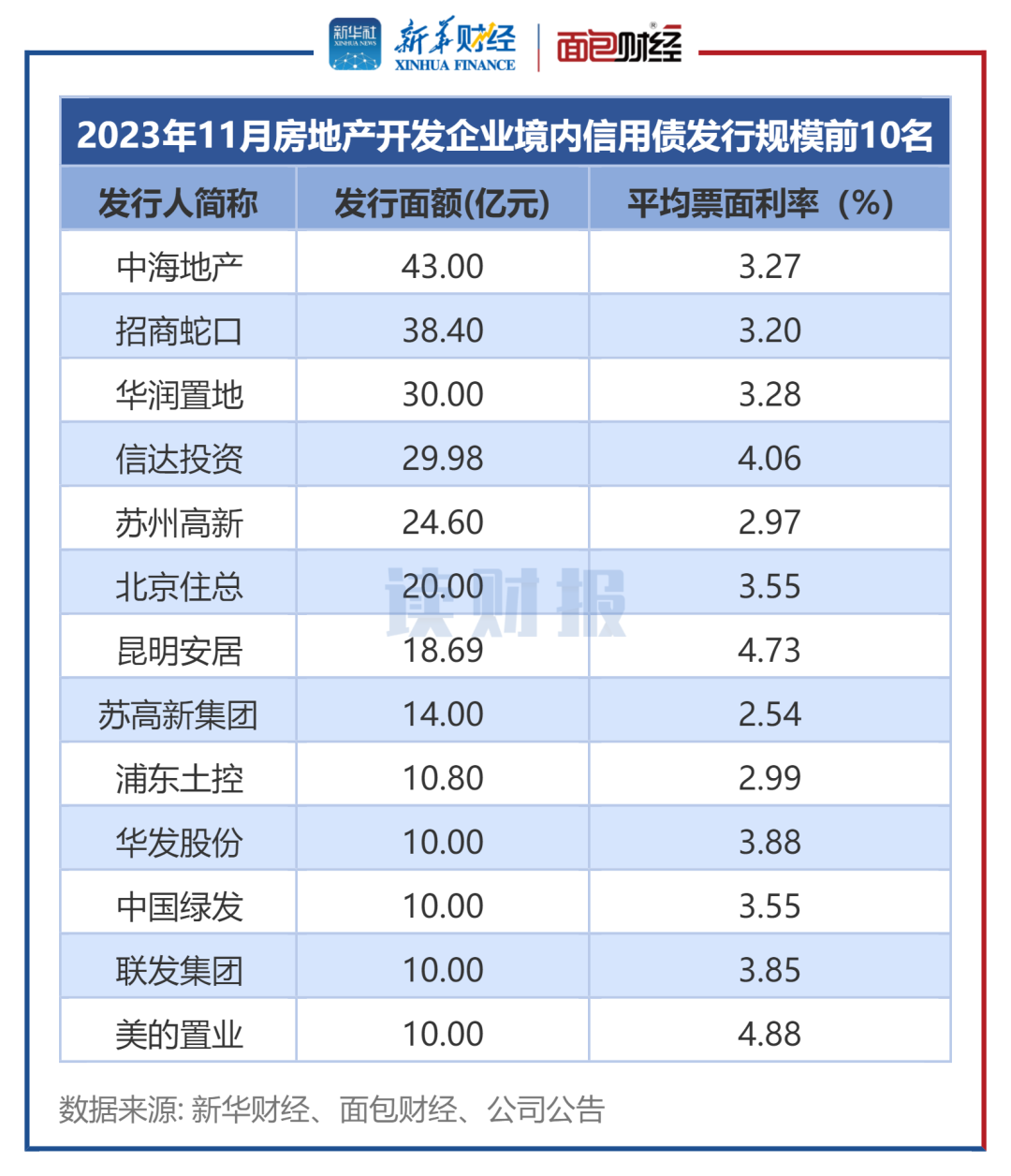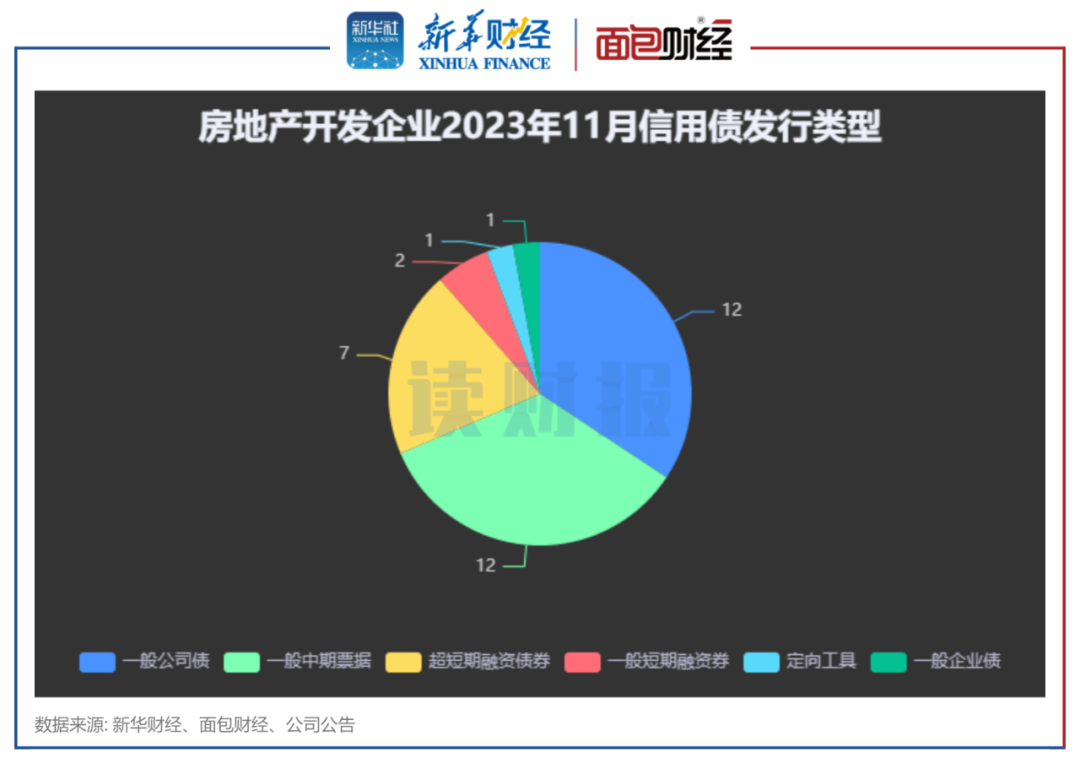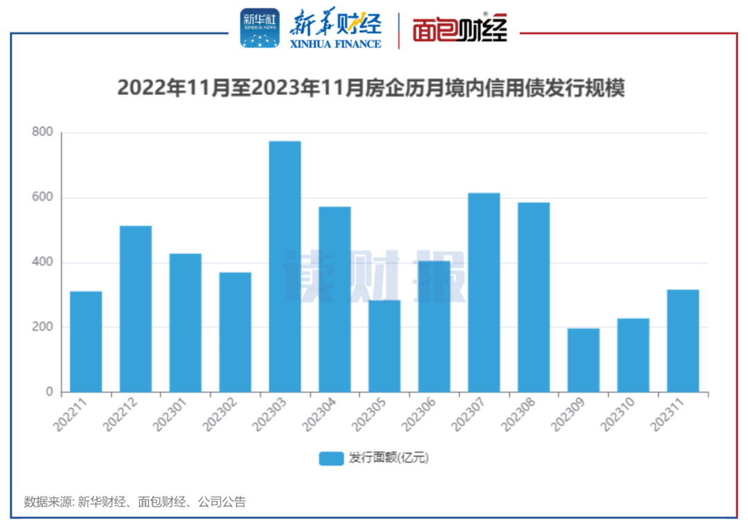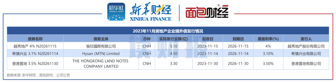 新华财经和面包财经研究员统计了国内房地产开发企业2023年11月境内信用债和境外债的发行情况。