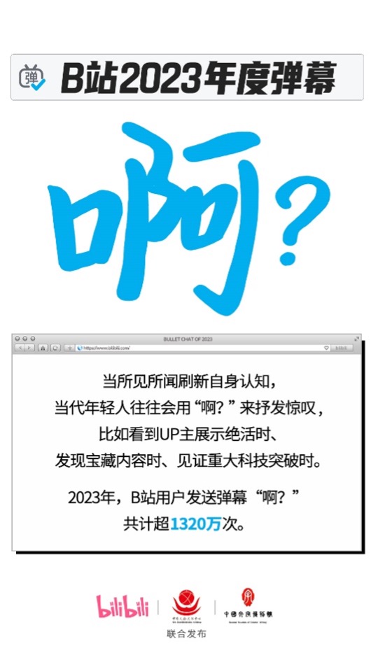 12月15日,哔哩哔哩(以下简称“B站”)与中国文物交流中心、中国文字博物馆联合发布2023年度弹幕——“啊?” 。今年,B站用户一共发送“啊?”超1320万次。
