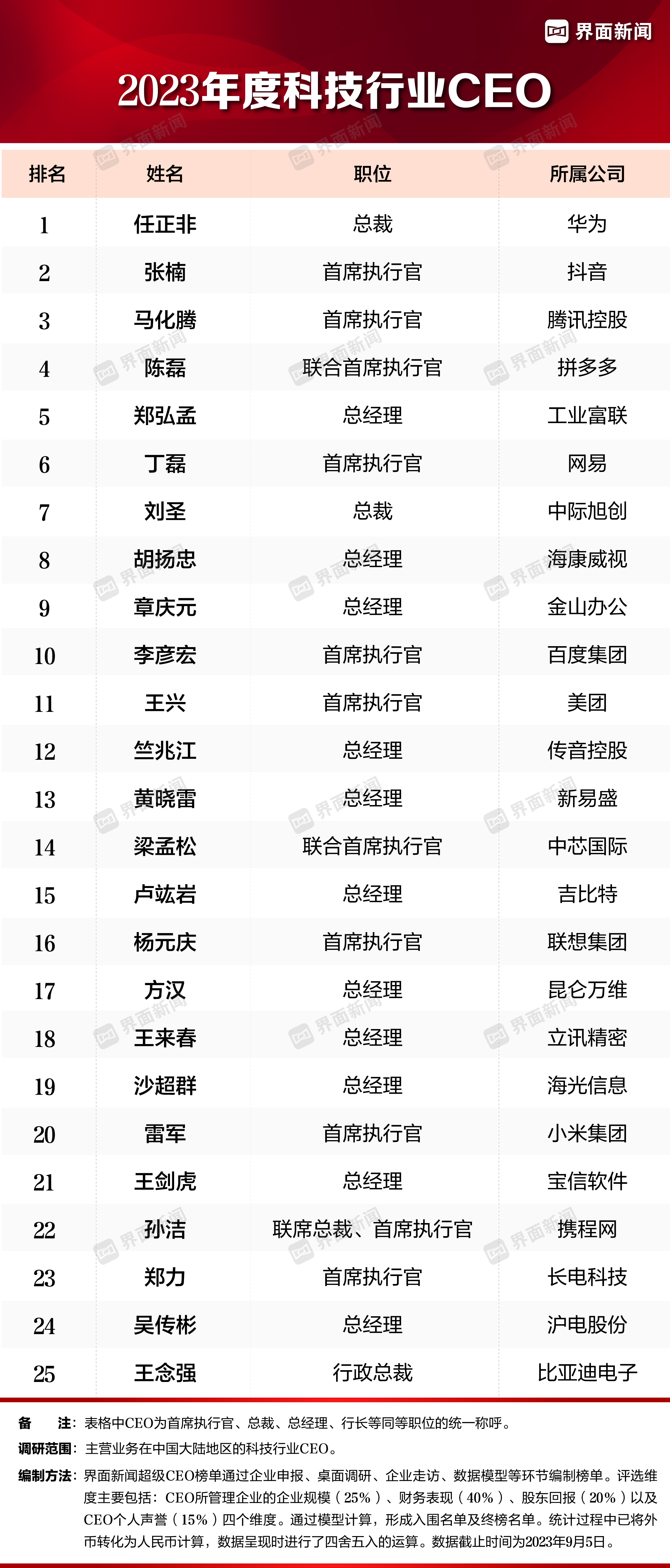 年度科技行业CEO榜单关注对象为中国大陆地区科技行业的在职CEO。本篇中CEO为首席执行官、总裁、总经理、行长等职位的统一称呼。“科技兴则民族兴,科技强则国家强”,一个国家的科技实力是一个国家综合国力的重要组成内容,是一个国家提高竞争力的重要表现。在建设科技强国的背景下,入选界面新闻2023年度科技行业CEO榜单的25位CEO带领企业巩固位置、稳步成长,表现非凡。