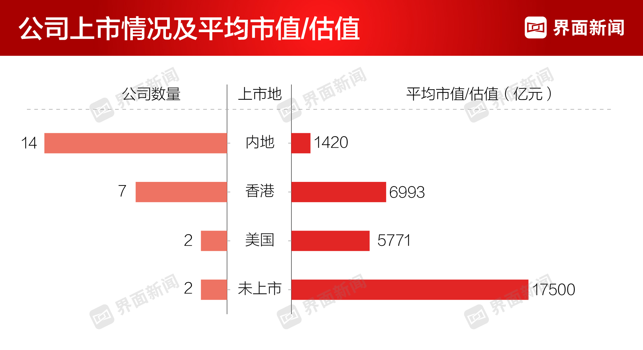 这25位CEO所在的公司,有14家在内地上市,7家在香港上市,2家在美国上市,2家未上市(多地上市的,以上市时间较早的为准)。从平均市值/估值来看,A股市场、港股市场以及美股市场的平均市值分别为1420亿元、6993亿元以及5771亿元。未上市的两家公司分别为华为和抖音,两家的平均估值达到了17500亿元。