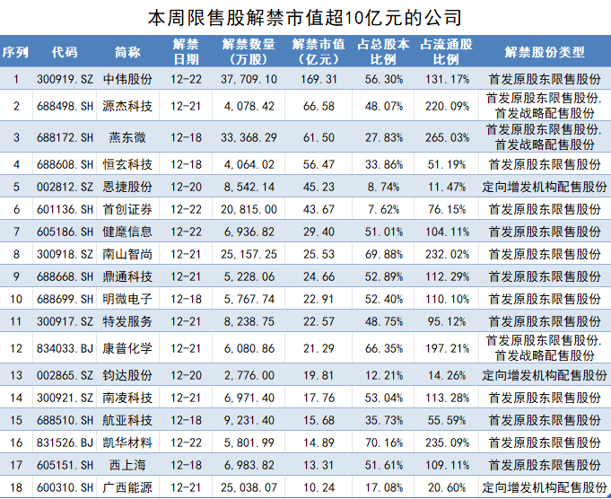 其中,解禁市值超过10亿元的公司有18家,中伟股份(300919.SZ)一家解禁市值约170亿元,源杰科技(688498.SH)、燕东微(688172.SH)、恒玄科技(688608.SH)三家科创板公司解禁市值均超过50亿元。