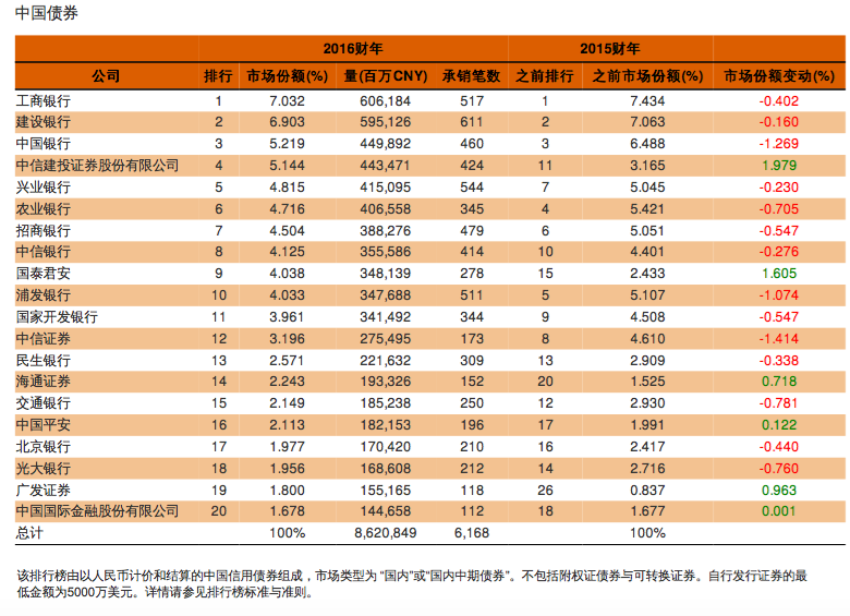 彭博近日发布2016年中国资本市场承销商排行榜。持续走牛的中国信用债发行量三年来首次增长放缓,2016年全年信用债发行金额较上年同期增长仅为9.28%,相较2014和2015的46.95%和40%,增长幅度大幅下降。