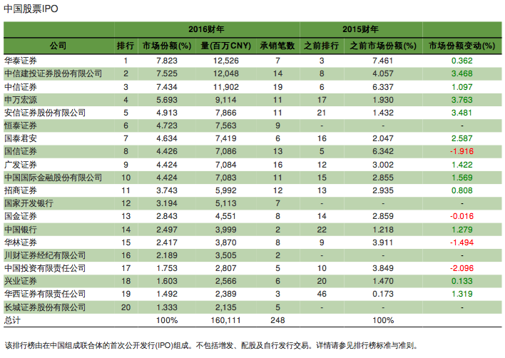 彭博的数据显示,华泰证券IPO承销额排名由2015年的第三名上升至2016年第一名。申万宏源、安信证券、华西证券进步较快。