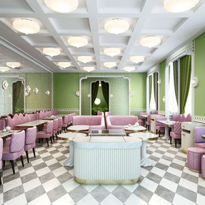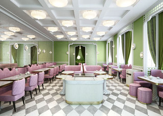 几何图形在室内设计中也反复被运用。餐厅内除了点缀Ladurée标志性的马卡龙,还在部分沙发上设计了甜甜圈一样的波浪边缘。