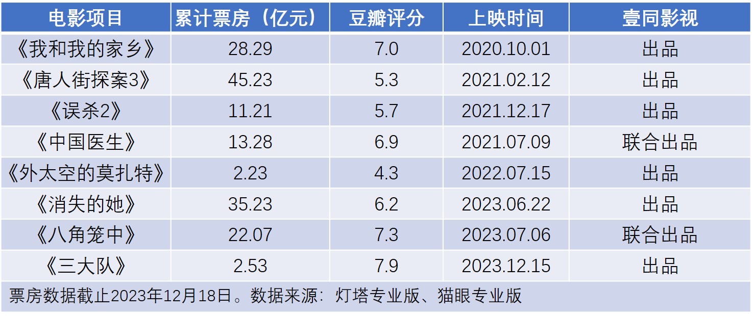 在具体项目中,壹同影视出品的6部电影中,万达电影参与了5部。除了联合出品《我和我的家乡》以外,万达电影在《唐人街探案3》《误杀2》《外太空的莫扎特》和《三大队》中都是出品方。而与壹同影视共同担任出品方的电影项目,几乎是万达电影2020年以来历年票房最高的项目。万达电影2023年在内容板块式微,已上映的主控项目《宇宙探索编辑部》《倒数说爱你》《申纪兰》票房均未破亿,正在上映的《三大队》也是今年万达电影内容板块最后的希望。