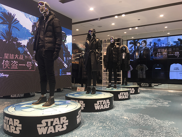 《侠盗一号》在北美上映一周后,片方就带着剧组来到北京水立方举办了一场首映礼,并且与前次合作的品牌优衣库一同展示了最新的星战文化衫,直到在内地上映前上海旗舰店中又一次搬出了与真人大小相仿的黑武士模型,中国市场的魅力可见一斑。