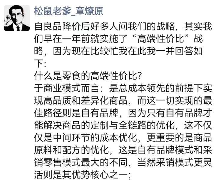 隔壁的三只松鼠董事长章燎原面对良品铺子的降价,也罕见在朋友圈发声:“其实我们早在一年前就实施了‘高端性价比’战略。”言外之意,良品铺子的战略,我们早在一年前就布局了。