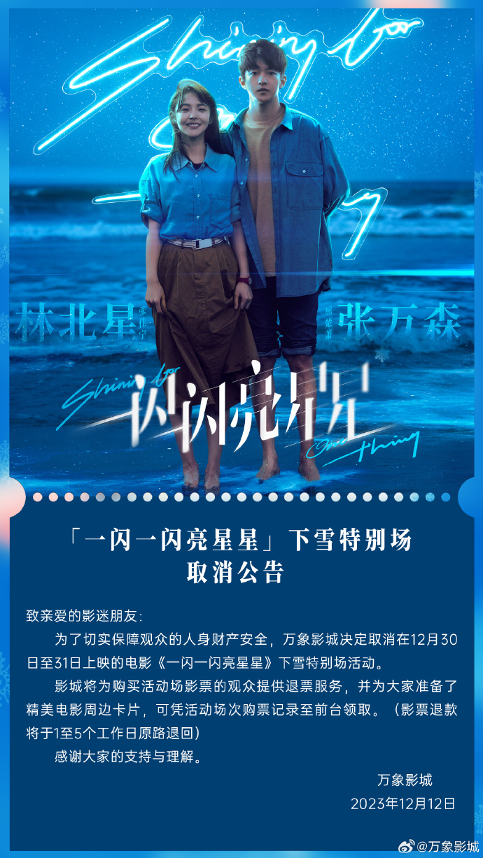 近日,万象影城微博发布公告,称为了切实保障观众的人身财产安全,影城决定取消在12月30日至31日上映的电影《一闪一闪亮星星》下雪特别场活动。“由于影厅属于密闭空间,为了大家的安全考量,不得已取消。”万象影城回应称。