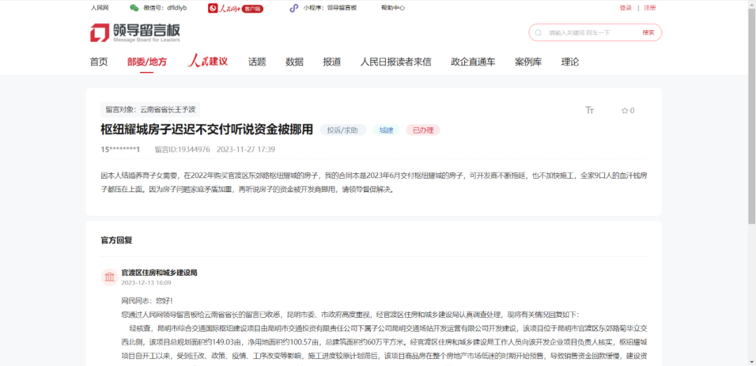 今年以来,有多名网友通过人民网地方领导留言板反映称:昆明的枢纽曜城项目原定于2023年6月交付,但开发商不断拖延,也不加快施工速度,项目交付时间反复延期。还有网友反映“项目长期无人施工”。