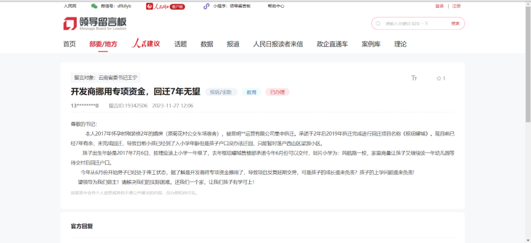 另外,有网友反映,刚装修2年的婚房(原菊花村公交车场宿舍)于2017年被集中拆迁,原本承诺于2年后也就是2019年拆迁完成,回迁到枢纽曜城,但至今还没有完成回迁,导致孩子已到了上小学的年龄,户口也无法迁回,只能暂时落户西山区梁源小区。