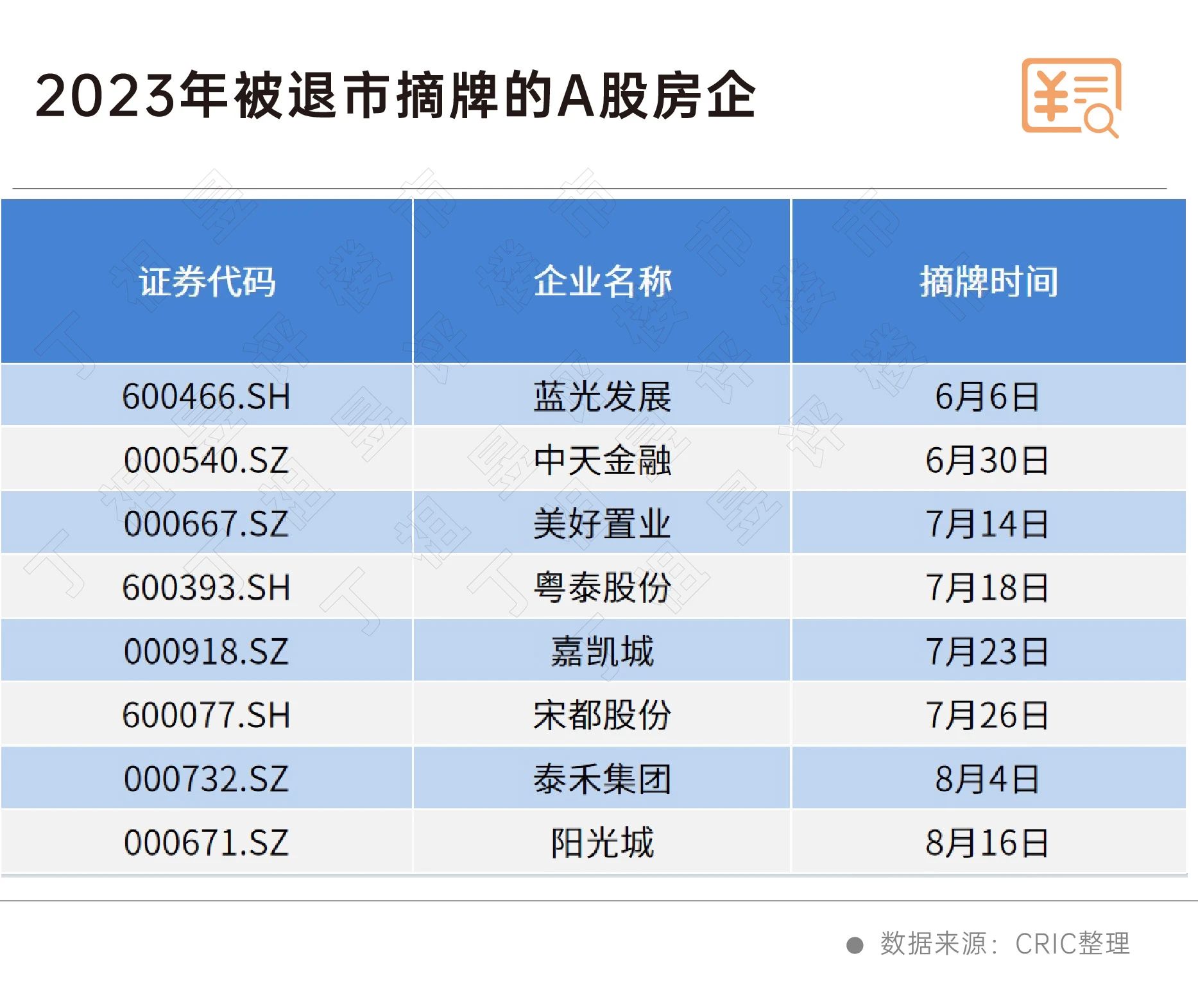 众所周知,A股有着“1元退市”的终止上市条件,即连续20个交易日的每日股票收盘价均低于人民币1元/股会被强制退市摘牌。据不完全统计,2023年共有8家A股房企被强制摘牌,其中包括蓝光、泰禾、阳光城这几家曾经的30强房企。