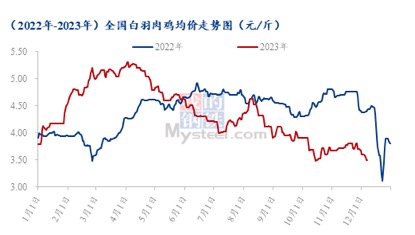 事实上,今年白羽鸡苗和白羽肉鸡都在年初冲高后于4月开始回落,8月有所短暂抬升,进而一路走低至今。12月白羽肉鸡价格甚至达到两年新低。