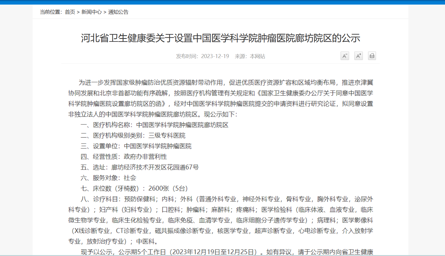 河北卫健委的这份最新公告显示,经对中国医学科学院肿瘤医院提交的申请资料进行研究论证,拟同意设置非独立法人的中国医学科学院肿瘤医院廊坊院区。该医疗机构级别类别为三级专科医院、设置单位为中国医学科学院肿瘤医院、经营性质为政府办非营利性。