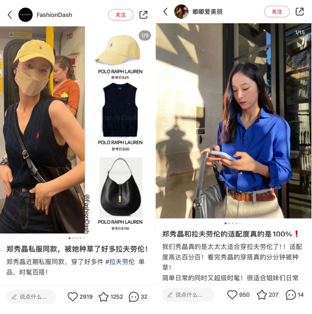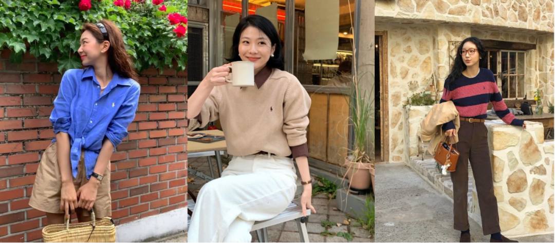 抖音和小红书上很多与Ralph Lauren相关的老钱风穿搭教程,都会拿韩国明星和博主作为样板,韩国博主soryounga、fever、jinju的穿搭被提及最多。很多消费者不一定知道Ralph Lauren跟美国梦、常春藤的关系,但他们记住了用绞花针织衫或小马标衬衫搭配出来的老钱氛围感。