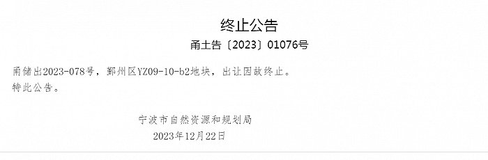 宁波市资规局日前发布公告,原定于12月25日拍卖出让的鄞州区YZ09-10-b2地块因故终止出让。
