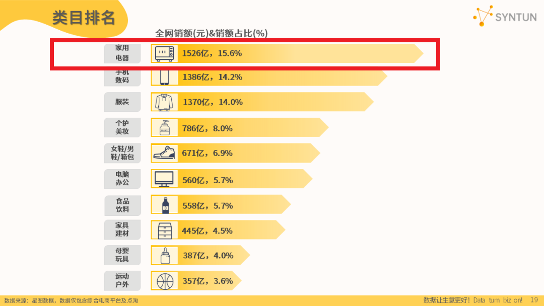 据星图数据公布的2023年双十一全网销售战报显示,在销售额TOP10品类中,家用电器以1526亿领跑,占总销售额比例为15.6%。