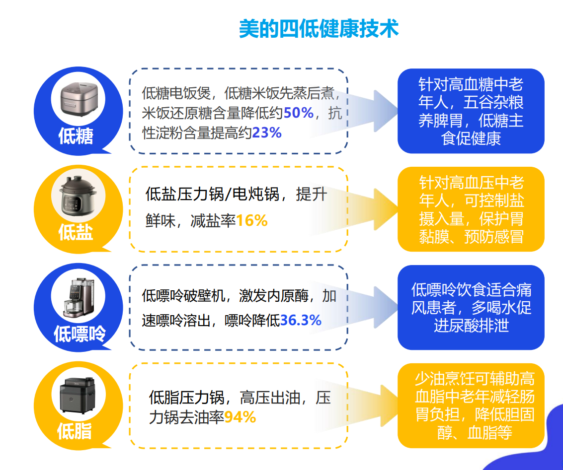 近年来一些家电品牌不约而同针对银发人群的个性化需求,推出不同功能的小家电产品。以美的为例,针对老年群体普遍面临的“四高”健康问题,美的推出了“四低健康“产品(低糖、低盐、低嘌呤、低脂),主打健康、美味和舒适,覆盖烹饪、饮品和环境三大场景,代表性产品包括: