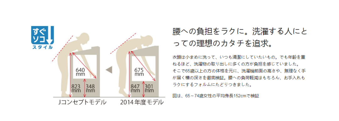 2019年,松下提出针对中国市场的“健康养老”战略,推出“不弯腰洗衣机”等适老产品,通过将洗衣机洗衣槽上移,同时增大洗衣槽的开口尺寸,让老年群体可以不用弯腰就够到衣服,大大减轻了老人的负担。