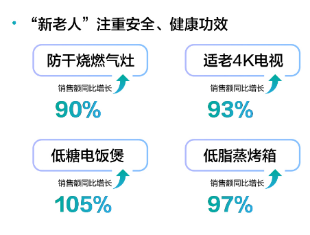 与此同时,苏宁易购发布的《2023年双11电器消费观察》显示,双十一期间,适老4K电视、防干烧燃气灶等适老化家电产品销售额增长近100%;低糖电饭煲、低脂蒸烤箱等小家电也备受新老人青睐,销售额增长达97%-105%不等。