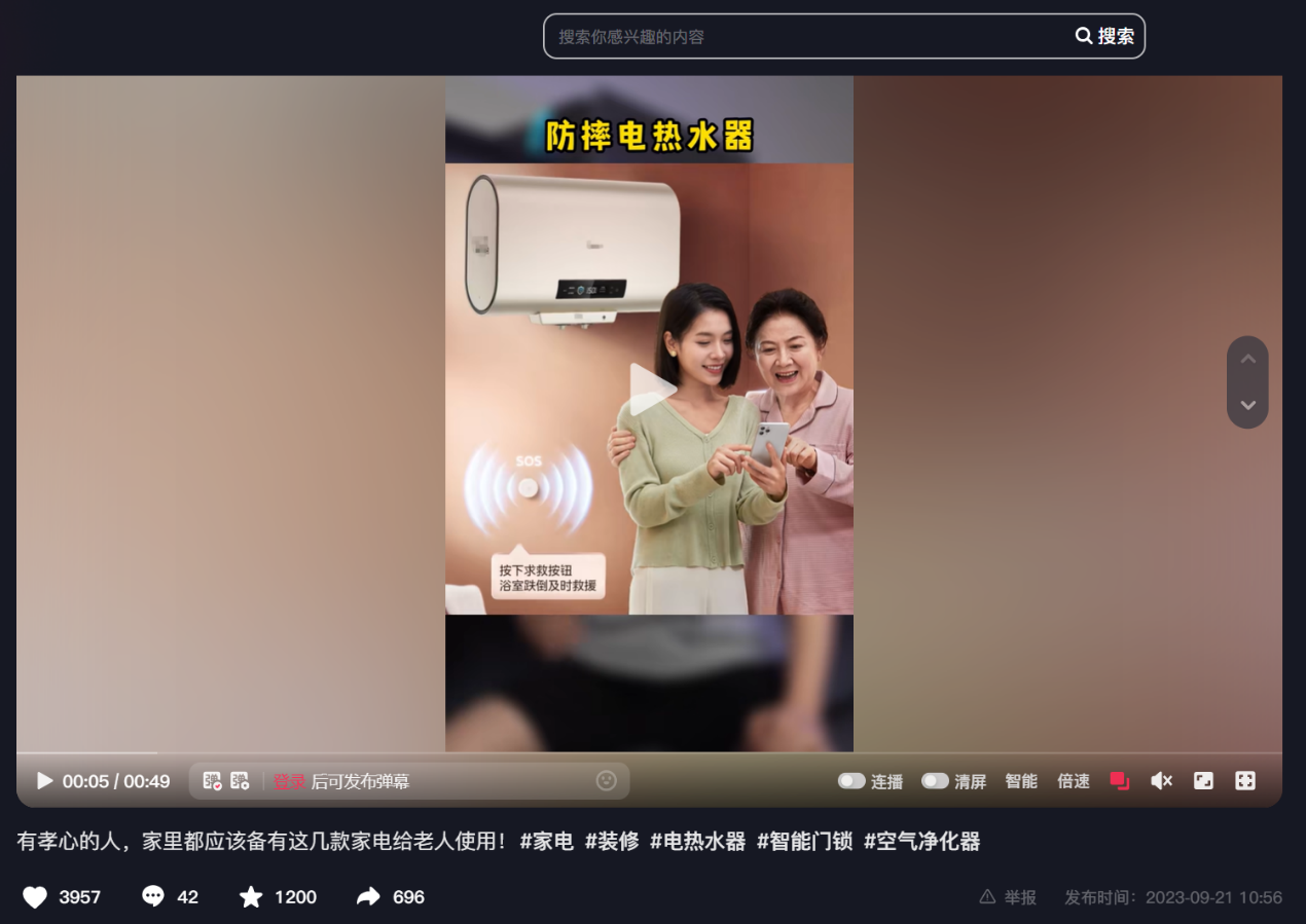 比如拥有71.7万粉丝的抖音家电达人“陶阳”,在一期视频中介绍了防摔电热水器、空气净化器等适老化家电。截至目前,该条视频获得了3900个点赞和1200个收藏,吸引了不少用户在评论区交流使用心得。