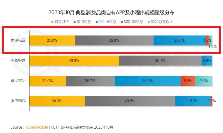 据QuestMobile《2023年消费品类私域获客研究报告》,家用电器品类的私域流量用户消费能力高于公域流量用户,线上消费2000元以上用户占比中,家用电器的私域用户占比达到39.5%。
