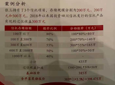 举例来看,以张三持有了3个信托项目,存续规模分别为200万元、200万元和300万元,2018年以来因投资四川信托发行的信托产品实现的过往收益300万元,他最后如获得早签奖励,累进计算扣除后,他的报价为398.475万元。