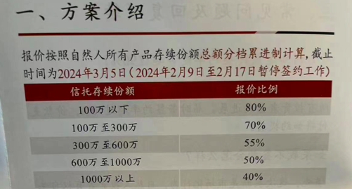具体来看,该报价报价按照自然人所有产品存续份额总额分档累进制计算,截止时间为2024年3月5日(2024年2月9日至2月17日暂停签约工作)。