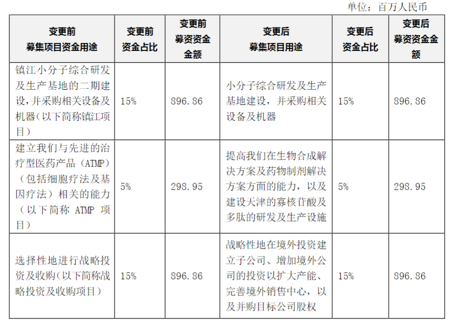 相较而言,原本用于ATMP(治疗型医药产品)项目的2.99亿元全部转移到“生物合成解决方案及药物制剂解决方案能力提高及建设天津的寡核苷酸及多肽的研发及生产设施项目”上。