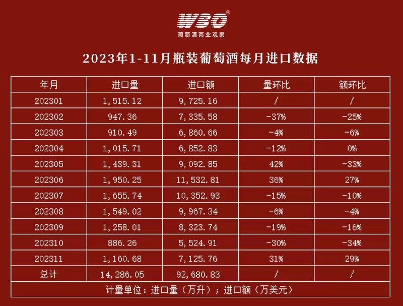 邻近春节,进口商可能存在备货心理,原本低迷的进口数据或有回升。虽然此前进口葡萄酒在中国销售市场表现疲乏、进口数据相对低迷,然而相较10月触底情况,11月进口数据已有明显提升。海关发布2023年1-11月数据显示,同比去年1-11月,今年葡萄酒进口量额降幅分别为26.21%、18.42%。前期进口量下跌主要受大环境影响,渠道库存较为充足,且前几月进口商对市场预期无明显改善。面对航运价格上涨,进口商当下将面临来自成本与货期双重风险,或将再次打击其备货积极心理。若后期国内进口葡萄酒供需趋紧,短期内或将导致国内欧洲进口葡萄酒价格为航运价格攀高“买单”,面临价格上涨的情况。