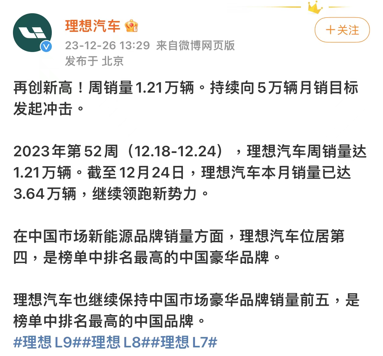 理想汽车官博12月26日宣布,持续向5万辆月销目标发起冲击。2023年第52周(12.18-12.24),理想汽车周销量达1.21万辆。持续向5万辆月销目标发起冲击。截至12月24日,理想汽车本月销量已达3.64万辆,继续领跑新势力。