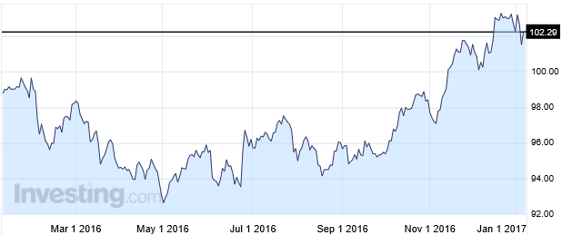 Marketwatch的文章说,美元加速上涨并不意外。去年12月,美联储实施了自金融危机以来的第二次加息,并增加了2017年预期加息次数。几天前公布的12月议息会议纪要显示出美联储两年来最“鹰派”的口吻。与此同时,继去年英国脱欧公投和意大利总理辞职后,欧洲的政治泥潭让欧元持续受到打击。此外,日本央行仍在负利率和激进债券购买计划上执意前行,抑制了日元的上行空间。