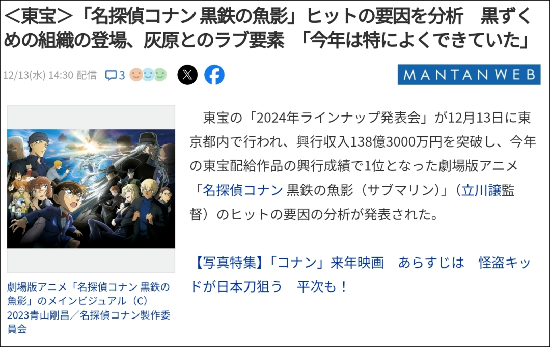 2023年《黑铁的鱼影》成为柯南IP在日本最高票房后,东宝复盘这部剧场版成功原因时,加入了一条:柯南与灰原哀的Love要素。