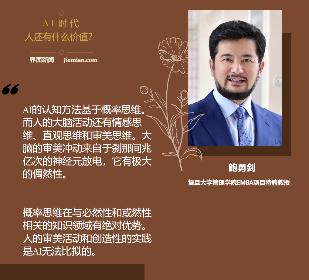 鲍勇剑:人的认知活动有AI不能完全覆盖的方面。人的隐性知识优势可以被模仿,但无法完全替代,甚至超越。迄今为止,AI的认知方法基于概率思维。人的大脑活动还有情感思维、直观思维和审美思维。特别是在审美思维方面,大脑的审美冲动来自于刹那间兆亿次的神经元放电。它有极大的偶然性。概率思维在与必然性和或然性相关的知识领域有绝对优势。人越来越无法与AI竞争。但是,涉及到审美冲动的偶然性,它不在概率思维统治范围内。因此,与审美冲动相关的审美信息就具有人的认知活动独特性。许多专家类别的隐性知识也与专家的审美冲动有关。它无法全部被编程,只能个人理解,不能完全向大众解说。如此,人的审美活动和创造性的实践是AI无法比拟的。