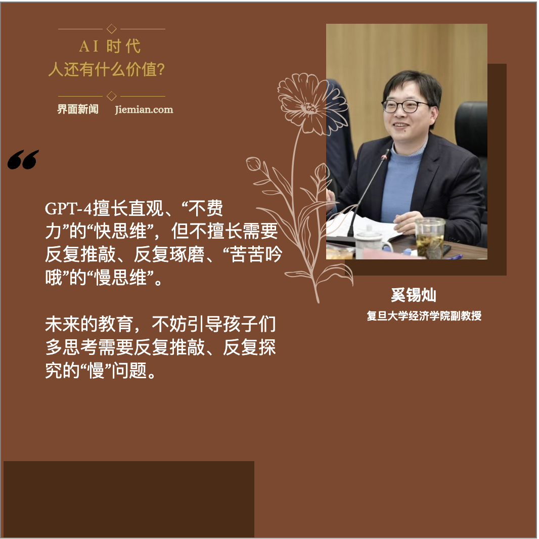 从人类和AI的比较优势来看,目前人类有的一个优势是体察、照顾同类的情绪。因此,我们的教育要在培养孩子们的同理心上多下功夫。另外,正如上面提到的,AI擅长“快思维”,但在“慢思维”上尚有局限。我们未来的教育,不妨引导孩子们多思考需要反复推敲、反复探究的“慢”问题。