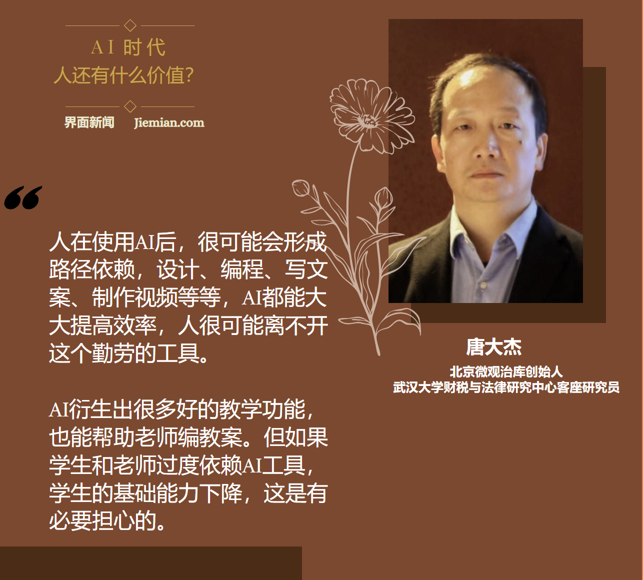 唐大杰:首先,人是主导AI进化的设计者、指挥者,也是应用AI的使用者。人的价值在于此。