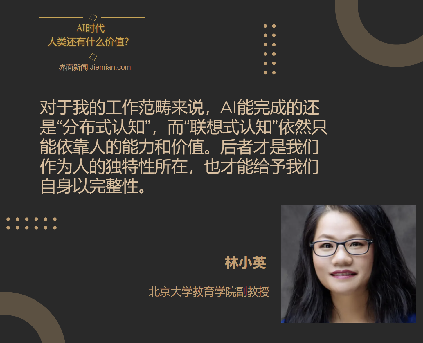 林小英:真正的“求知”(knowing)过程,还是人自己完成的,迅猛进化的AI对于我的工作范畴来说,能完成的还是“分布式认知”,而“联想式认知”依然只能依靠人的能力和价值。后者才是我们作为人的独特性所在,也才能给予我们自身以完整性。