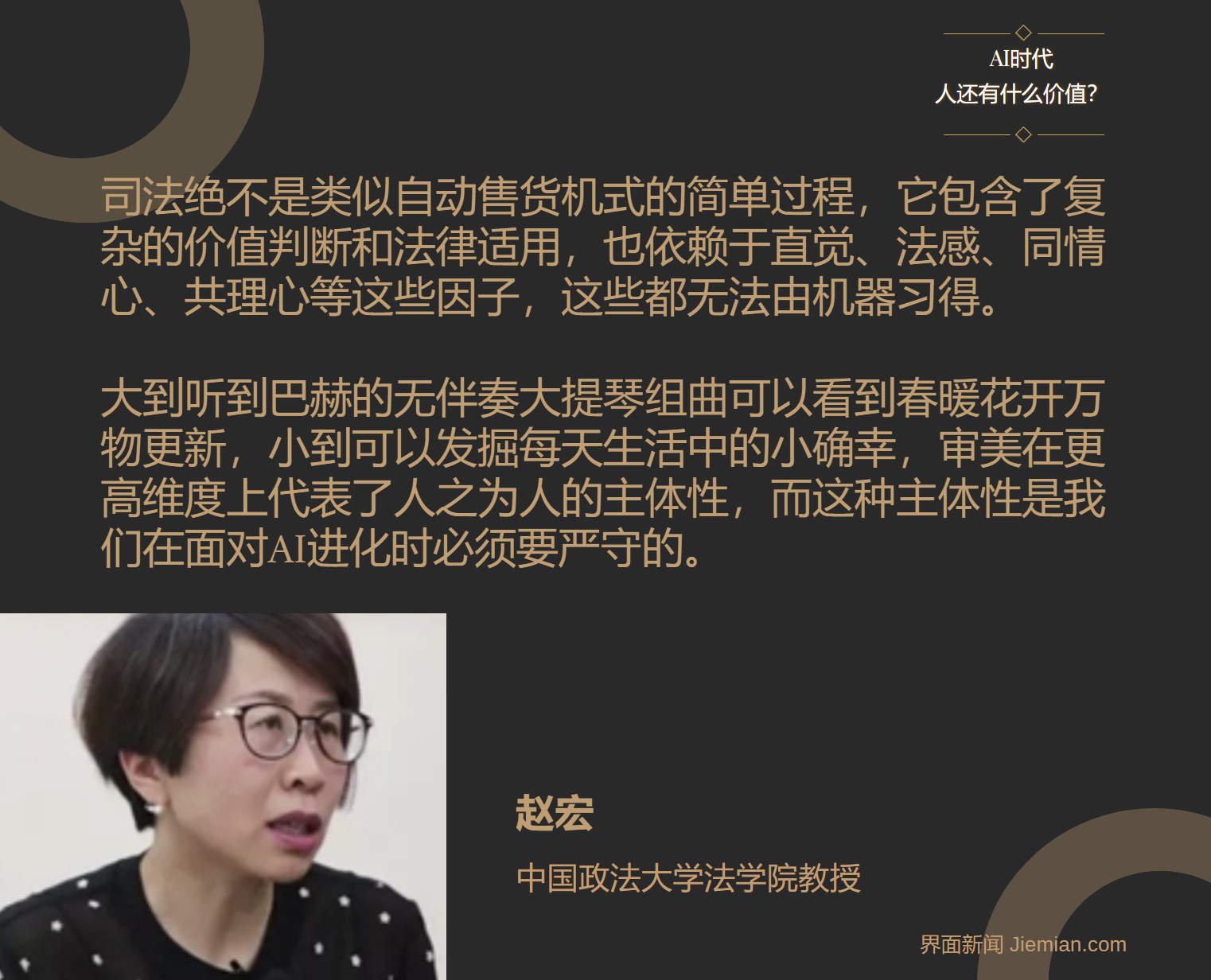 赵宏:我常常被人问,我们法律行业是否很快就被AI替代,而我总是笃定地回答,不会。就司法审判而言,完全由机器来承担就是难以想象的。因为司法绝不是类似自动售货机式的简单过程,它包含了复杂的价值判断和法律适用,也依赖于直觉、法感、同情心、共理心等这些因子,这些都无法由机器习得,而且机器不会把人当成人,不会展现对他人的尊重和同情。但反过来,也有越来越多的法律辅助性工作被交由AI完成,AI也展现出越来越强的深度学习能力,那人的能力和价值还哪些地方是机器不可比拟的呢?