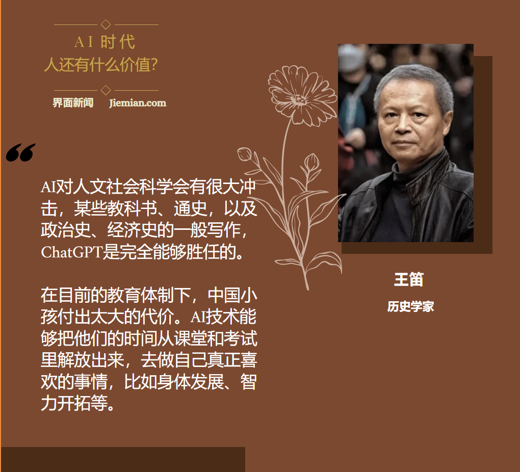 王笛:随着AI技术的发展,死记硬背肯定是行不通。如果我们继续老的教育方法和理念,很快就会被世界拉开距离。青少年应该从死记硬背的、以考试为中心的教育中解放出来,越早越好。现在中国小孩在目前的教育体制下浪费了,他们不应该付出这么大的代价。AI技术能够把他们的时间从课堂和考试里解放出来,去做自己真正喜欢的事情,比如身体发展、智力开拓等。面临这样的选择和机遇,我希望决策者把教育理念的调整作为当务之急。