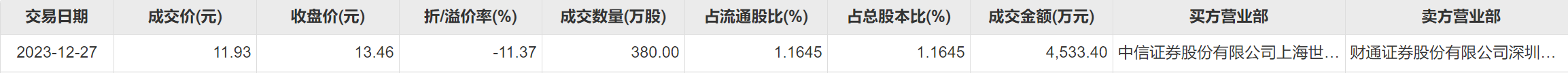 12月27日,骏亚科技今日大宗交易成交380万股,成交额4533.4万元,占当日总成交额的43.71%,成交价11.93元,较市场收盘价折价11.37%。