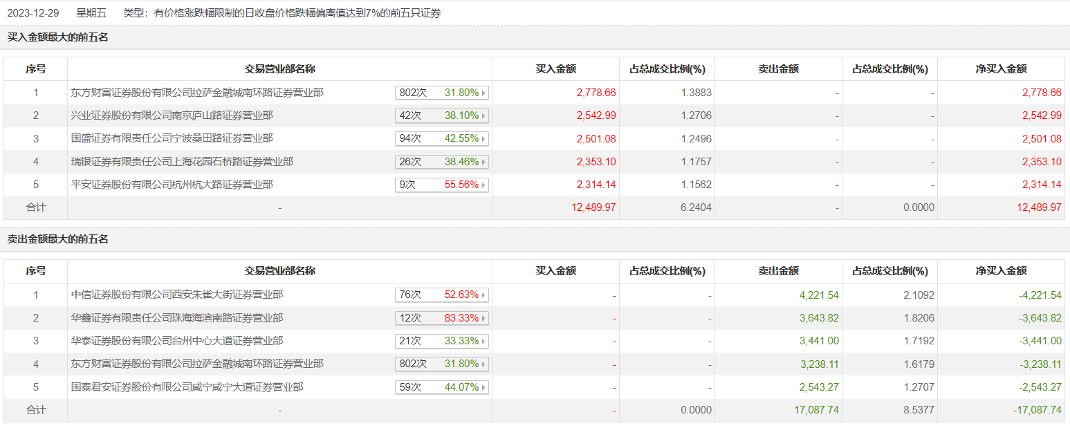 龙头股份12月29日跌7.2%,龙虎榜数据显示,上榜营业部席位全天成交2.96亿元,占当日总成交金额比例为14.78%。其中,买入金额为1.25亿元,卖出金额为1.71亿元,合计净卖出4597.77万元。