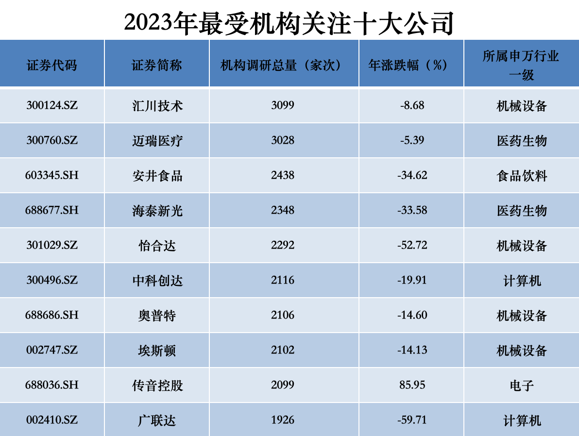 “工业自动化龙头”汇川技术(300124.SZ)成为A股2023年“调研王”,全年接待机构量达3099家次。迈瑞医疗(300760.SZ)、安井食品(603345.SH)则分列第二、第三位,年内接待机构分别达到3028家次、2438家次。